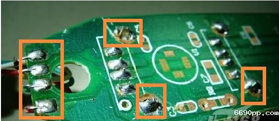 6、焊接点凝固的过程中,切记不要用手触碰焊接点。焊接点在未完全凝固前,即使有很小的振动也会使焊点变形,引起虚焊。因此,在烙铁头撤离之前对焊接件要予以固定,如用镊子夹持,或烙铁头撤离之后快速用嘴吹气,采取这些做法的目的,就是缩短焊点凝固的时间。