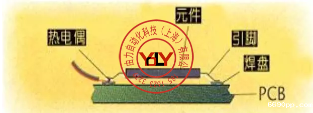 (图一、将热电偶尖附着在PCB焊盘和相应的元件引脚或金属端之间)