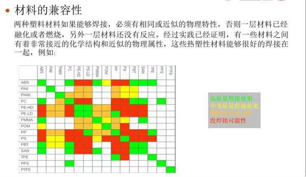 许多用户询问彩色塑料组合间的焊接问题,一般而言,其焊接难度和成本如下: